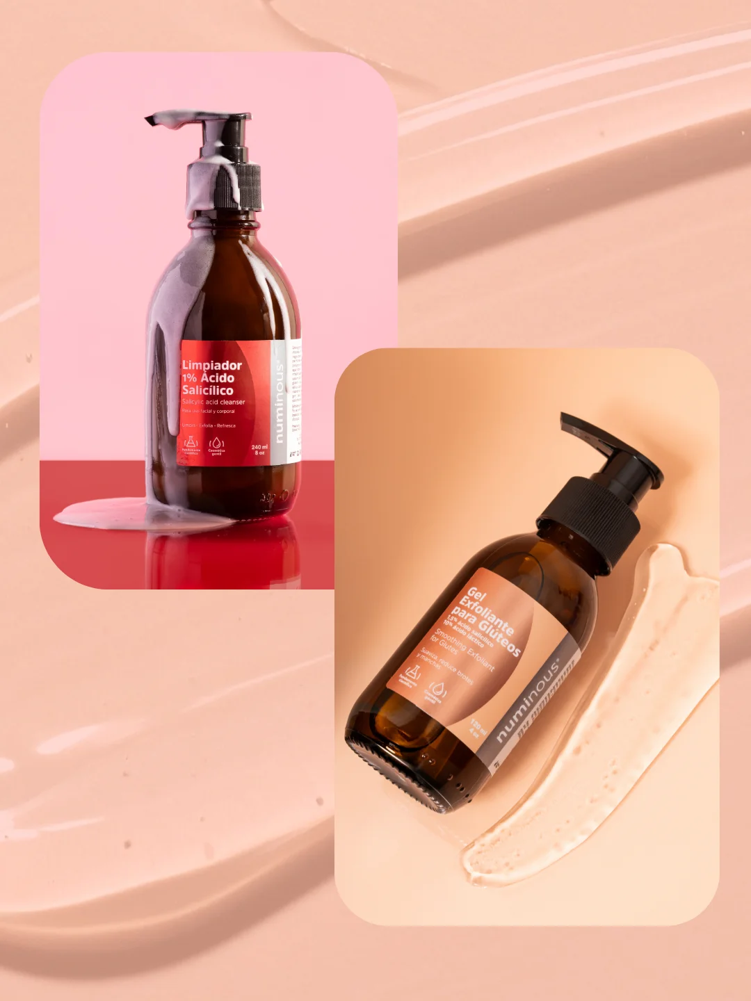 Dos productos formulados para actuar dentro del poro (Limpiador BHA 1%) y en la superficie de la piel (Exfoliante para Glúteos), aportando suavidad, uniformidad y claridad del tono.